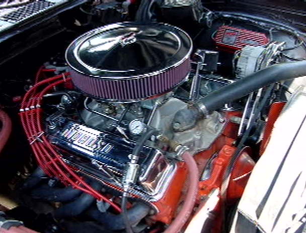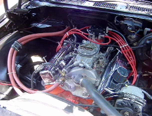 engine, that powers my El Camino. My el camino originally came with a 327 C.I. engine and a two speed automatic powerglide transmission. The 350 C.I. has, TRW flat top pistons, MSD 6A ignition unit, MSD Blaster II high voltage output coil, MSD rotor, MSD super conductor 8.6mm wires, Autolite double platinum spark plugs, Streetdampr hi-performance harmonic balancer, performer intake manifold, S/R Torquer 2.02 cyclinder heads, 67cc chamber with 171 intake runners, Holley 650 double pumper with mechanical secondaries and a Holley fuel pressure guage, Crower hydrolic camshaft with .444 lift, Comp cams 1.6 roller tip rocker arms (.474 lift with the 1.6 roller tip rocker arms), modified Millings high volume oil pump, K&N Filter Charger air filter, double roller timing chain, Headman hedders, 2 flowmaster mufflers with a cross over, 700R4 4 speed automatic transmission (installed by BowTie Overdrives in Hesperia, CA) a 1800 stall locking style torque converter, external transmission oil cooler, Modine 3 core radiator, a GM 12 bolt differential with a 3.42 rear ratio, high performance Strange ring and pinion gears and a Eaton posi-tracktion carrier. The differential (was taken from a 69 Chevelle SS396), Moroso tall chrome valve covers, and almost 100,000 miles to boot, and still runs very strong and it's still very fast! I use Valvoline 10-40 motor oil and Fram extra guard oil filters.