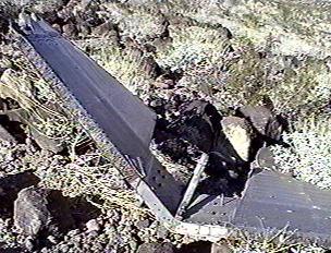 The complete rear vertical wing, and the rear section of the jet, laying on it's side.