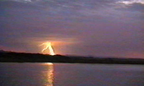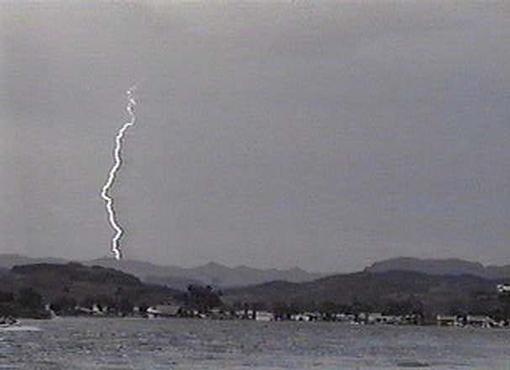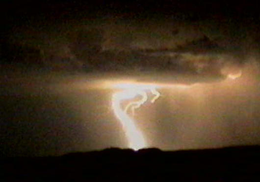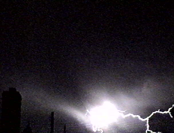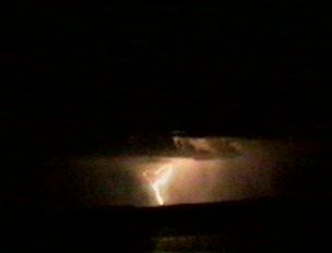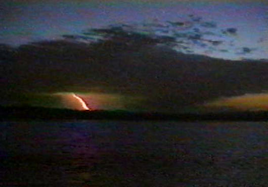 Click here: A lightning strike that struck into the trailer park across the river! Loud thunder included. September 7th 2002. (2.14MB : 12 Seconds)