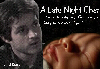 Wandering over to the window, Vin looked out at the city's darkened skyline. Listening intently, he waited for the soft sound of a burp. When it came a minute later, he adjusted Joshua again until the baby was reclining in his father's arms. "All done pardner?" He queried, watching as the infant's eyes slowly began to close again. "Guess so." He noted after a moment.
