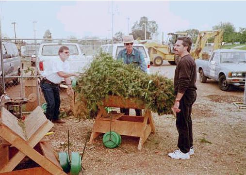 (December 2000) Here's John Chandler, Hal Black, and (my dentist) Dr. Doug Grosmark of the Kiwanis Club of Grantville-Allied Gardens. They're setting up a tree for the Christmas Tree Lot - the biggest fundraiser of the year. I personally put in over forty service hours at the tree lot in 2000 alone... although I've been working there every year since the early 1990's. The blue pickup truck in the background (far right) belongs to John Chandler, and we use it to deliver trees. It caused us a few problems this year. I had to wait for over forty minutes at a stranger's house one day for AAA to arrive since the truck's battery wouldn't start!