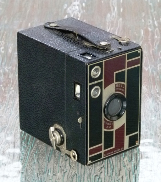 The No. 2A Beau Brownie is a variation of the No. 2A Brownie which was manufactured in the U.S. and United Kingdom between 1930 and 1936. It has an Art Deco front plate designed by Walter Dorwin Teague. There were five different color options.