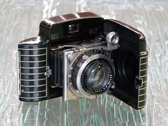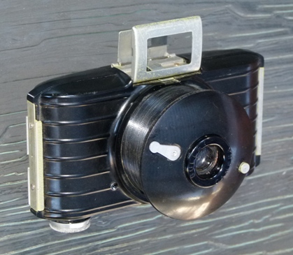 This camera has a covered metal body with two brilliant viewfinders. The front panel has a geometric Art Deco design.