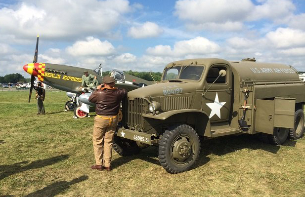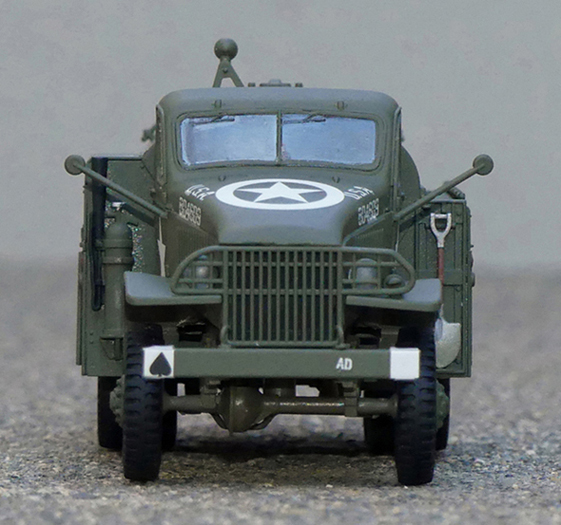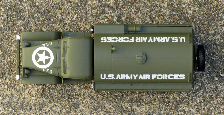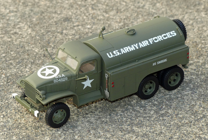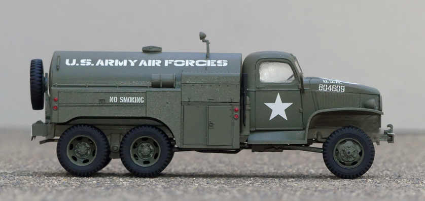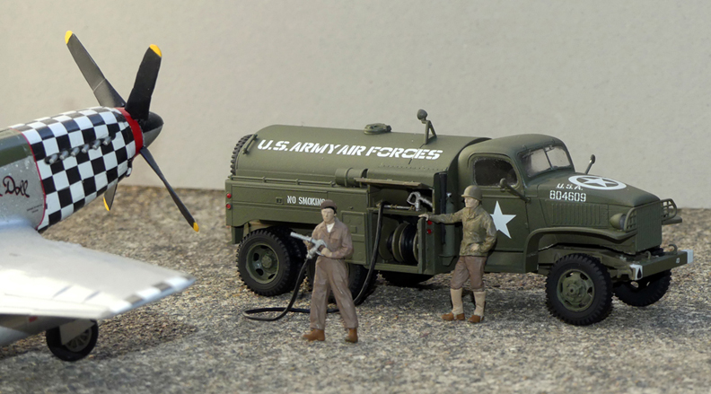 The model is painted and marked to represent a fuel truck used by the U.S. Army Air Forces in France during WWII.