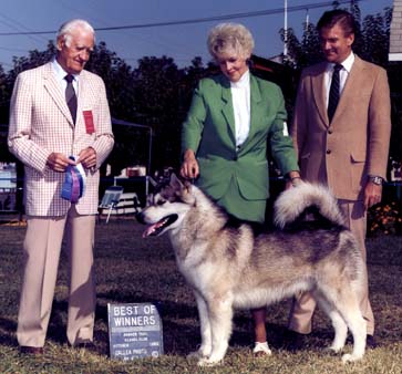Chassie was my sister's first female Malamute. Her breeder was Kimberly Meredith. She was out of Ch. Lorien's Man O War of Snoridge, ROM and Ch. Snokimo's Little Moon Doll. Chassie is shown above, at three months of age winning the Working group at her first match. In the second picture Chassie is shown winning the Senior Bitch class at the 1978 Northern California Specialty, at 14 months of age.