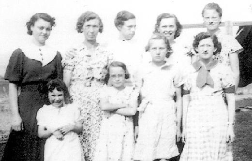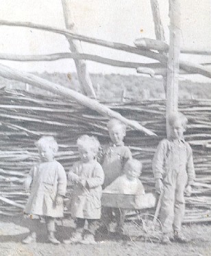 Picture on left, left to right: Leonard, Francis, and Neil Mathews -- sons of Elmer Winfred Mathews and Mary Evalyne Hallford -- Right picture, Dorothy, great-grandmother Mary Evalyne Hallford, Evalyne, Emma, Elinor, Shirley, Esther, Charlotte, and Ruth
