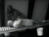 wearing a leather mask and lapping water from a steel bowl at her feet.