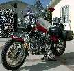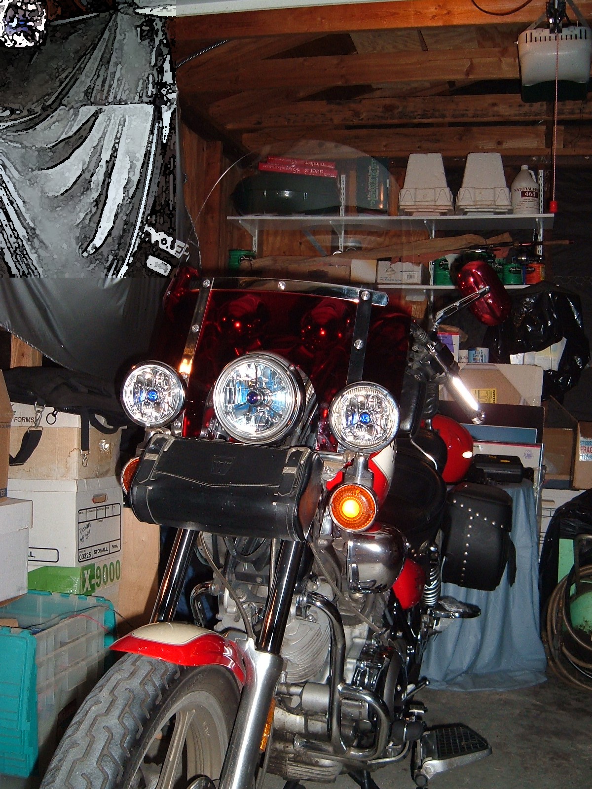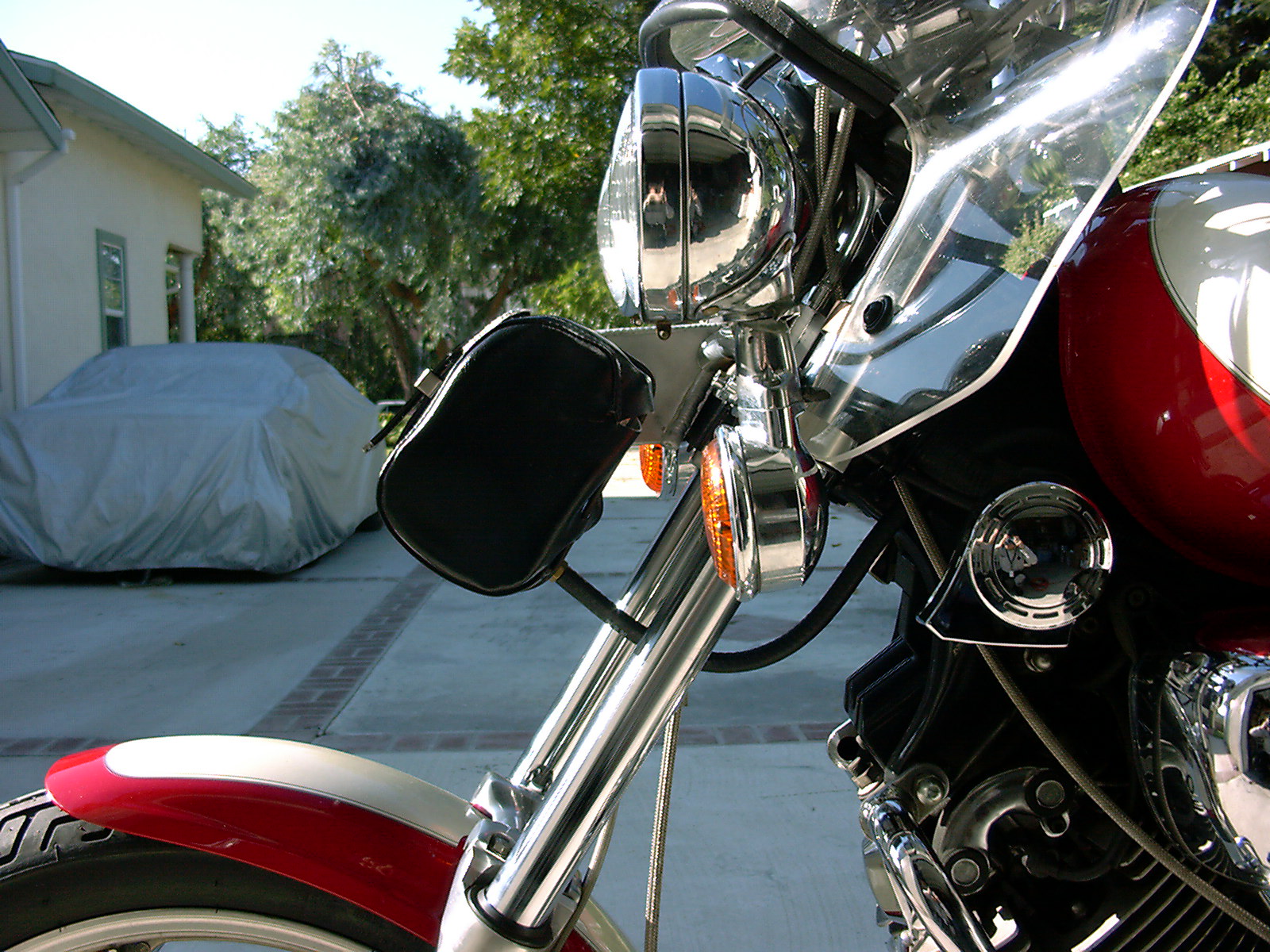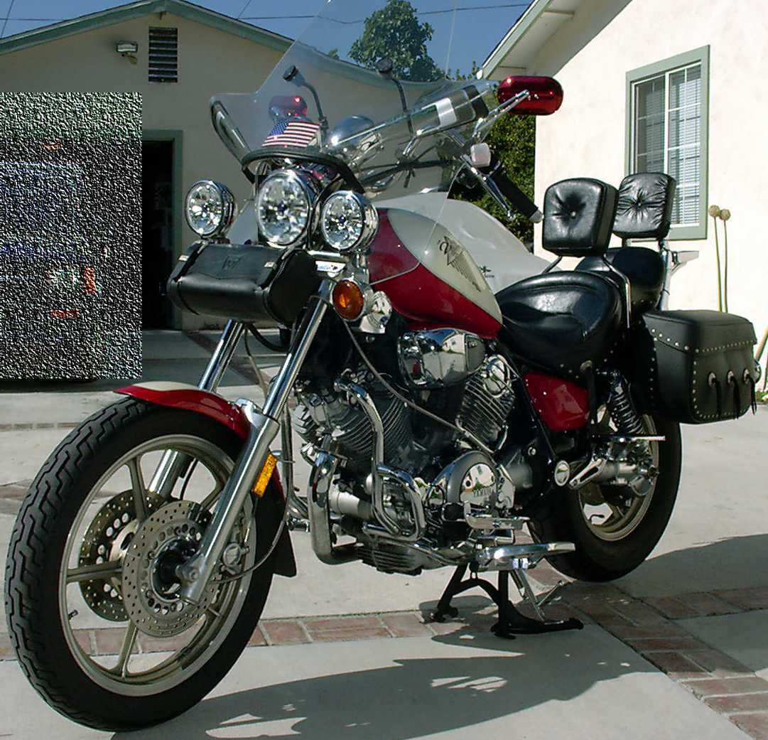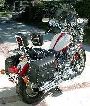 2002 - Kuryakyn red powder-coat mirrors (http://www.kuryakyn.com), Trillient headlamp and driving lamps (http://www.adjureinc.com), M/C Enterprises floorboards and H/T shifter (http://www.mcenterprisesusa.com), K&N FilterCharger air filter (http://www.knfilters.com), Splitfire triple platinum plugs (http://www.splitfire.com).A set of JC Whitney passenger floorboards (http://www.jcwhitney.com p/n AAP069188Y - they fit perfectly in the stock clevis mounts and even clear the larger V&H exhaust pipes). Note: Installing the Trillient Headlamp required a custom mount because most OEM 5-3/4" headlamps have neat welded on positioning brackets instead of taking standard replacement lamps. I placed a 3-inch hose clamp around the base of the Trillient, and fabricated two bent Z-shaped brackets with holes for the existing positioning bolts and springs out of a couple of old PC slot blocking plates. The brackets go under the hose clamp, and the ends thread onto the aiming bolts with the stock nylon nuts holding them in place. There are so many extra wires packed into the OEM headlight case, the lamp stays perfectly in-place without further stabilization. For what it's worth, they do provide very even light patterns, without the usual dark shadows in the beam.