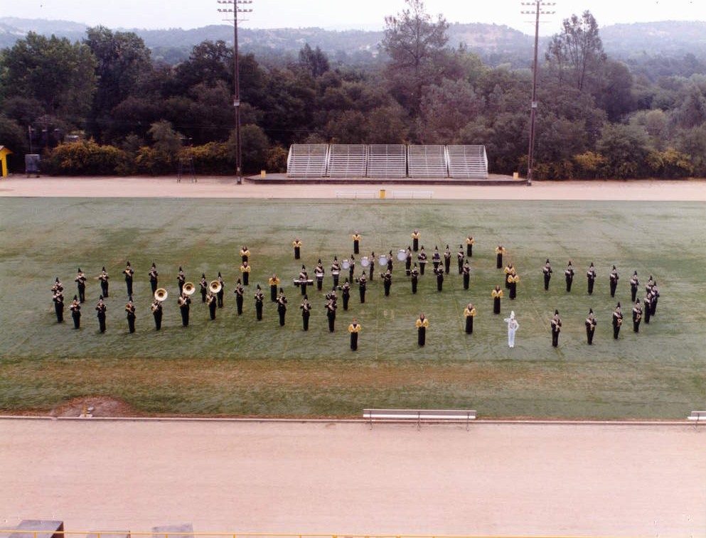 The Del Oro High School Band at their stadium in Loomis, CA., with the Sierra-Nevada Foothills