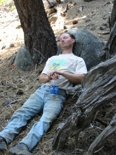 This days hike was the hardest. We had to climb this really steep up hill part, and we had to go back almost all the way we came. We stopped for a little while at Tule lake so we could rest and eat lunch I also went swimming. After our break we hiked up to a half way point. Mom and Phillip went home on one trail and I stayed with Rocky and Ryan. After that we hiked a half mile to Doris lake where we would camp. Ryan took off his pack and went into the town (a half mile away) to get some water. He also brought back a lemonade for me and Rocky, I chugged mine in about 4 gulps because I was so tired of water. I went swimming at Doris lake and met some really nice people. I also jumped off this bag rock into the lake, it was really scary. The other cool thing about the lake was that when you stood still fish would swim around your legs. That night we all sat on a big rock and looked at the stars, we also looked at bats flying around. That night I slept in the tent with aunt Rocky and Ryan had to sleep outside.