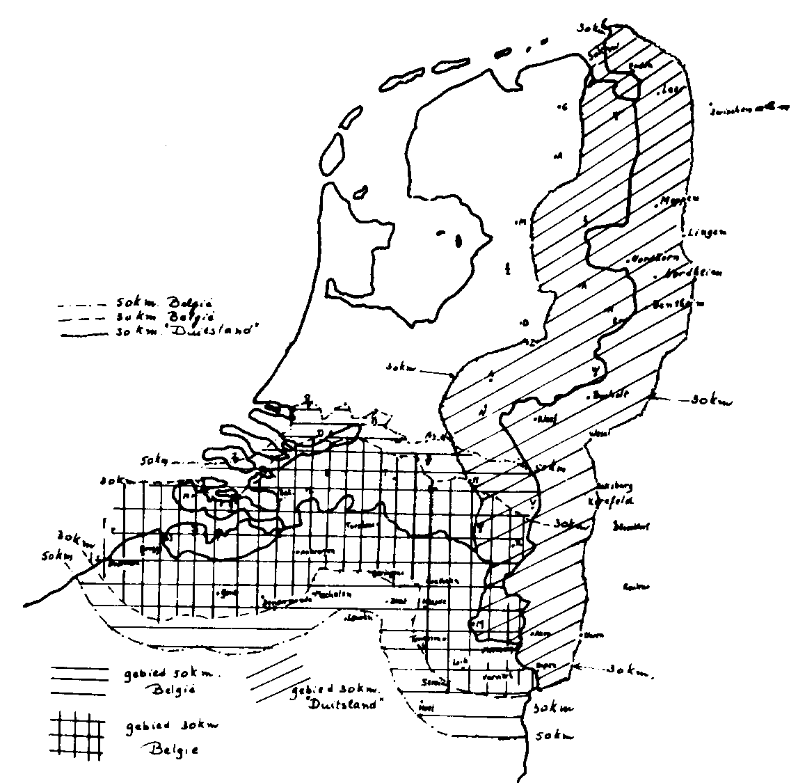 Map showing the 30 km range with Germany and the 30 and 50 km border ranges with Belgium ("Veendamphila 1983")