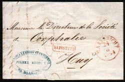 The 1865 convention with Belgium introduced a 30 Km max. distance. The local postage was now 5 cent for franked - and 10 cent for unfranked letters. Maastricht had in 1865 local postage with 27 different offices in Belgium, of which the more important were: Liège, Maaseyck, and
