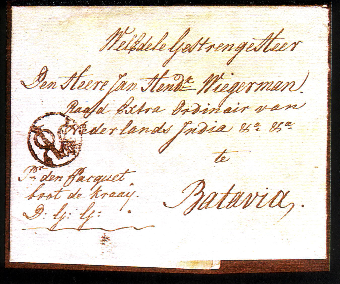 It is interesting to note what ultimately became of the ten vessels. Maria Louisa Captured by the English near Cape of Good Hope. Faam Captured by the French and moved to Brest. Vlijt Diverted to Norway (due to War with England couldn’t reach A’dam). Luchtbol Sold to the Danish East-Indië Compagnie. Expeditie Captured by the French. Haasje Captured by the English. Snelheid Sold to ‘Noorderkwartier’ (Dutch Navy) Star Captured by the English. Zeemeeuw Sold to the Danish East-Indië Compagnie. Kraai Stayed in Asian waters till at least 1801. How much mail was transported by these packetboats? During the period 1788-1794 about 56,000 letters were sent from the Netherlands to the Far East, while about 50,000 letters were sent the other way. The total intake in guilders was roughly 75,000 guilders, not sufficient to finance the trips, but with cargo and passengers on board as well it made some contribution to the actual costs of these trips. References: Perry Moree Met Vriend die God Geleide, 1998, Walburg Press Alex ter Braake Early mail by ship to and from the Netherlands Indies, 1967, A.P. Congress Book, Vol. 33 Dr. G. Hogesteeger a.o Naar de gordel van smaragd, 1995, PTT-Museum Rietdijk Postzegelveiling # 556, 1995, Rietdijk Auctions P.C. Korteweg De V.O.C. stempels, 1929, Nederlandsche Philatelisten-Bibliotheek J.H. Beer van Dingstee De Ontwikkeling van het Postwezen in Ned. Oost-Indië, 1935, Drukkerij A.C. Nix & Co., Bandung