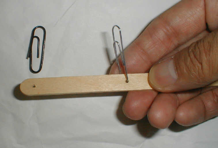Drill a small hole as close to the center of the stick as you can. You may wish to use a ruler to measure. Drill another hole near one end of the stick. The positioning of these holes does not have to be absolutely precise; the scale will be calibrated, later. You could also use the awl from a pocketknife to make the holes, if you don’t have a drill handy. The holes should be big enough to hook a paperclip through.