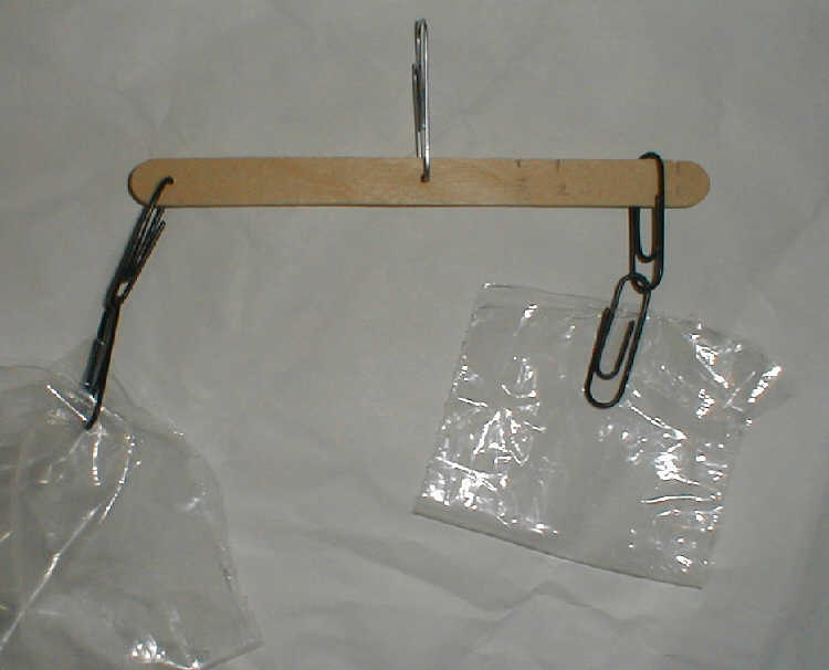 Now thread one paperclip through each hole. Add more paperclips as shown below. Notice that the paperclips on the right are slipped over the stick, not threaded through a hole. Finally, cut some pieces out of a plastic bag to use as holders for the weights. The scale is now ready for calibration.