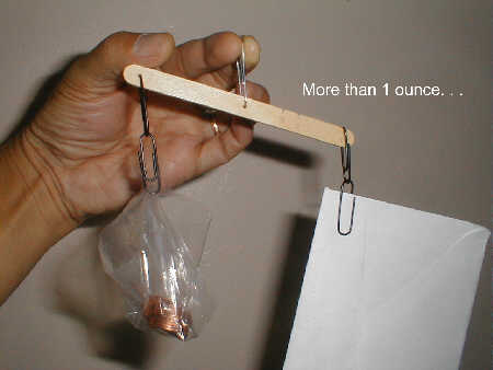 Try the letter on the 1-ounce notch, first. If the letter goes up, it weighs less than one ounce, and one stamp will suffice. If the letter goes down (as shown above) it weighs more than one ounce. In that case, try the 2-ounce notch. If the letter now goes up, the weight is between 1 and 2 ounces, and requires the 2-ounce rate. This operation can be repeated to find out whether the postage for 3 ounces will suffice.