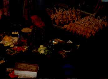 Kota Bahru's colorful three-story market was great fun. On the ground floor was the produce and fish, as well as about an inch of standing fish water (don't wear sandals in there!). There was also a huge stack of chickens. One never knows what they'll find in these markets. On the second story are the food stalls, and on the third story are the endless booths of textiles. It's really easy to get lost in the endless mass of batik, songket, and silk.