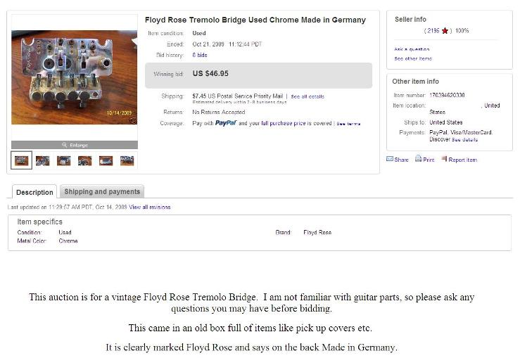 First off, it has to be worth it. What I mean by that, is the "piece of junk" you buy has to be a good deal, because you have to spend some money to get it back into shape. The Floyd Rose I purchased here on eBay, was just $46.95 (plus shipping) - what a deal! It's important to note that a circa-1980s, chrome Floyd Rose in very good to near-mint condition sells between $175-$200 on eBay (2009), depending on the condition and accessories. So it's not a good deal to pay what I did and then invest another $200 in parts! Luckily, I have a lot of Floyd parts laying around, so I usually can save $$ by piecing together some things that already own.