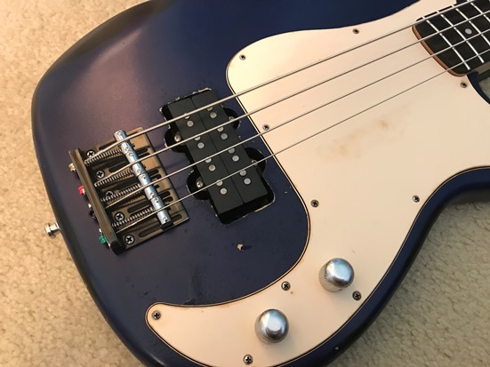 painted KnE body with Warman MM4 Alnico V bass humbucker and Hipshot KickAss bridge