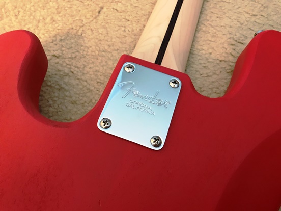 For the final chrome accessories, I added Schaller straplocks, Fender Squier tuners, a Fender vintage bridge with brass saddles, a Fender neck plate, and a Fender Fatfinger clamp that attaches to the headstock. It really makes a difference in tone and sustain.