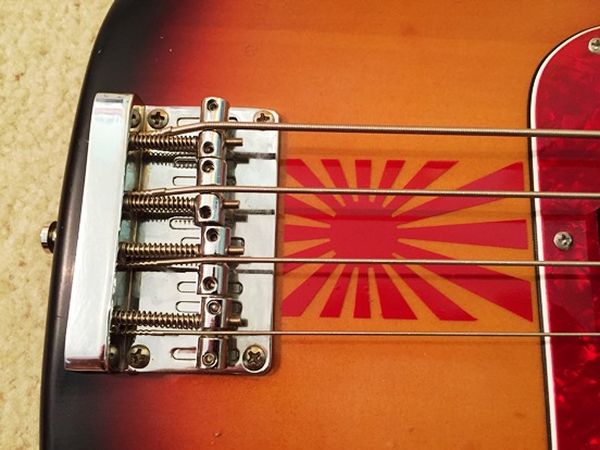 I thought this bass needed a change, as I didn't like the way it looked - too boring. So I ordered a new SX bass neck with a different headstock (blank) and a rosewood fretboard. I also found a guy on eBay that made vinyl Tokai decals, so no more Killer (maybe one day I'll get a real Killer guitar). I was able to re-use the existing tuners, so no hardware changes - just a new neck with a Tokai logo. I aged the body a bit more, and added a rising sun decal next to the bridge, which seems to match and looks pretty cool. And that's about it - I think it looks better and the SX rosewood neck plays great!