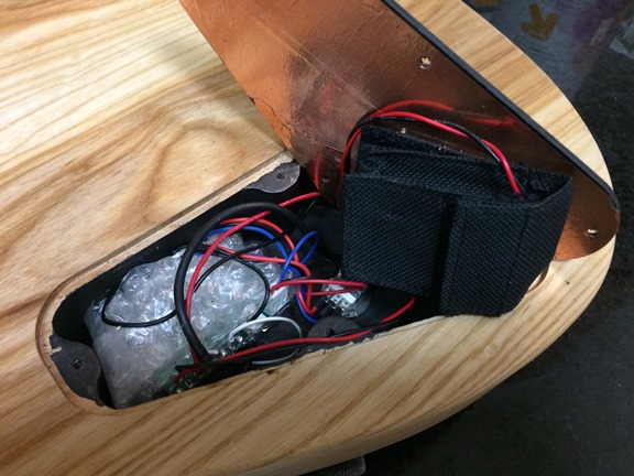 And then there was the electronics. It looks like there isn't too much going on as there's only one pickup, but this was a chore to wire up, and I kept putting it off. I tracked down a used Jackson J-80 humbucker and that was the easy part (my old Ibanez Destroyer had a J-90 and it had to be one of the best-sounding pickups I've ever had, but I sold it!). I then had to wire in the MODboard, and even though I had successfully done one previously, it was a pain, mostly because of the crammed guitar cavity. I had plently of room for everything with the Hondo Pirate, but the Charvel-sized cavity was barely big enough for the bubble-wrapped MODboard, 9-volt battery bag, on/off switch, volume pot, and dual concentric pot (delay feedback and time). In hindsight I should have routed some more room in there before I shielded it, but oh well.