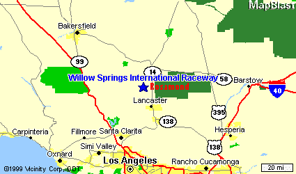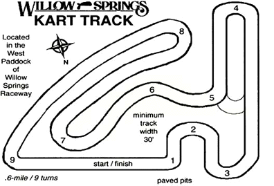 WILLOW SPRINGS KART TRACK: Follow above directions, except don't turn in to the Streets of Willow. Go 1/4 mile further to main Willow Springs gate. Practice is available on the kart track during the week. Call first to make sure the track is not rented. Call (661) 256-2471