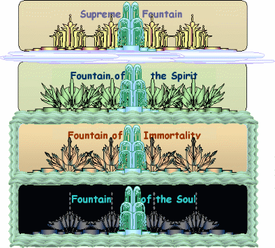 The Supreme Fountain in the Garden of the Essence is not directly connected with the flow of water in the garden immediately beneath it, and yet it is ultimately the source of the Fountain of the Spirit. The flow of water between the lower three gardens represents the various levels of intellect in their roles of the perception of spiritual truths. The Fountain of Immortality is pure reason and the Fountain of the Soul represents intuition and spiritual aspiration. The True Man uses some of the faculties in the Garden of the Soul to find the Return Path, just as a man with magnetic center is said to seek out a school of regeneration to begin the task of self-evolution. Ordinary, unregenerate man simply wastes the waters from the Fountain of the Soul on desires for outward things and gives no thought to their ultimate symbolic nature. In this perceptual trap, "A tree is just a tree."The Arabic word ayn can refer to both a fountain and an eye, thus drawing an immediate parallel between the flow of water and light for speakers of that language. The closest counterpart to this in the western experience was the Renaissance notion of the eye as a fountain of light, which scanned its surroundings like a radar beacon. This theory lead to the development of perspective in painting. The circulation of light between the gardens is shown in the next chart.