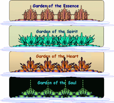 References to the perception of different kinds of light crop up in many places in Sufi lore. No less a commentator than the great Fourteenth Century Andalusian mystic, Ibn Arabi, drew on the Quran to describe the Gardens of Paradise, and explained how various elements move between them. In the Chapter of the All Merciful, the Quran mentions four gardens. The following chart shows how Arabi* described and related these paradises.