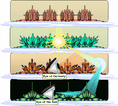 According to the commentator, within the Garden of the Heart the Fountain of Immortality, the Eye of Certainty and the moon are roughly equivalent. The Eye of Certainty, also called the Eye of Universal Perceptions, can see the rays of light travelling from the sun down to the moon, which symbolize the Path of Return, the Sufi Path. Thus, a Sufi master or Shaykh possessed of the Eye of Certainty knows the way as a matter of direct perception and can safely lead others after him.In the Garden of the Soul, the Eye of the Soul, or the Eye of Particular Perceptions, affords a less complete, but preliminary view of truth. The reflected moonlight in this garden highlights the meanings hidden within the physical objects of outward perception. It represents the faculty by which we may gain some glimmer of the symbolic nature of the world as it is perceived by the five senses. This anagogical, or "fourth sense" of things, echoes Gurdjieff's call to awaken. Mankind is enslaved by the incomplete picture of the world presented by our sense-driven machinery and its concomitant state of "waking sleep".