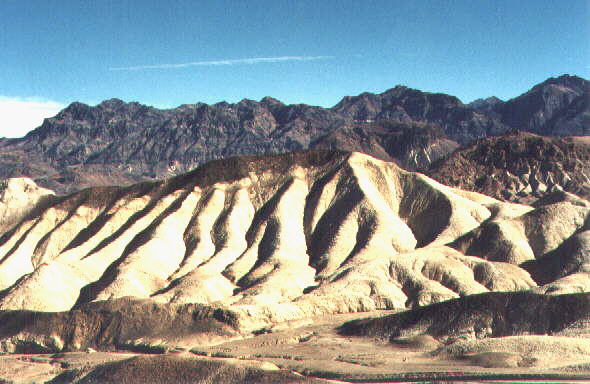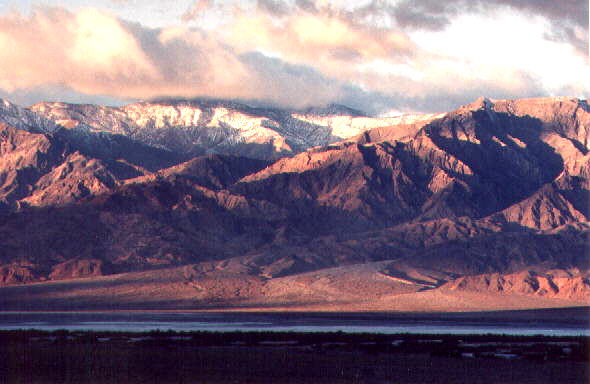 The eastern Panamints just after sunrise, viewed from the hill overlooking Texas Springs campground. See how sun and shadow change the landscape. |
