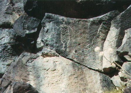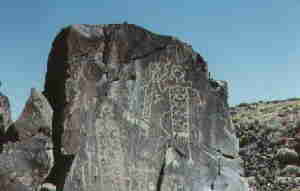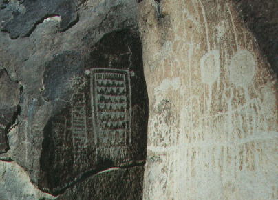 The Coso Petroglyphs:More Hunter and Blanket designs |