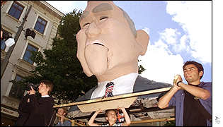 In environmentally-friendly Sweden, Bush was met by thousands of anti-American protesters in Gothenburg. Activists gathered outside the Radisson Hotel where he was staying and lowered their trousers to register their disgust. The protesters destroyed two police cars and hurled stones and bottles at officers who surrounded a school where activists were staying. They carried out mock executions in a homemade electric chair, dumping "dead" bodies into a funeral van. The demonstrators chanted, "Get back, get back, get back to where you once belonged." They marched through the streets portraying Bush as Darth Vader above a warning, "Say no to Son of Star Wars." (Los Angeles Times, June 15, 2001)