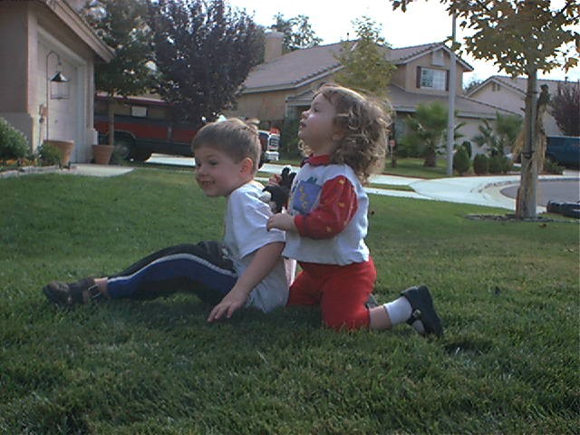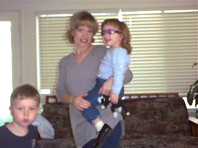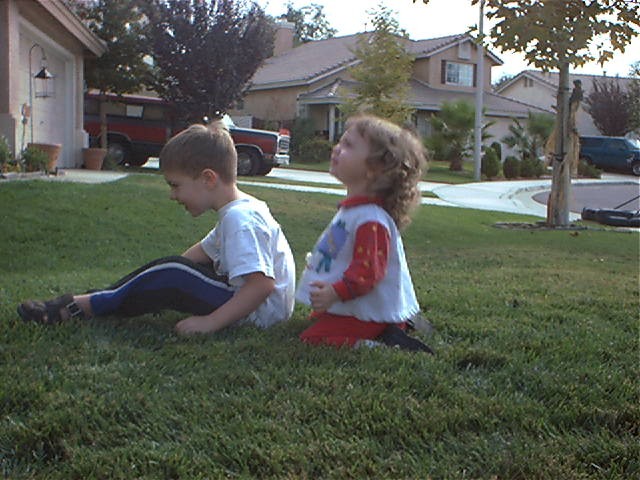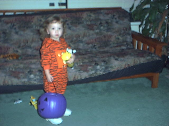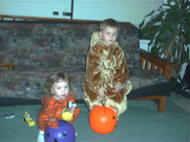 Here are a couple digital Halloween costume pics, but the kids refused to put their hoods on. It is hard to tell, but Kevin was a really nice Kangaroo and Jessica was in a Tigger outfit. I have some hard pictures that need to be developed that will help you see them better. In the meantime, here: