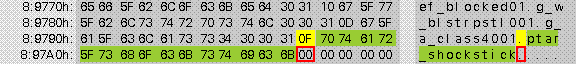 This is where it pays to take a look at what the actors in a given area are equipped with. In the triggered cutscene just as you enter the main corridor, there are 3 Black Vulcars fighting with an equal number of Beks. One of those Vulcars always drops a shockstick, in this case it's referred to as "ptar_shockstick". ALthough this is a 15 [0F] byte lable, it's at the end of the item list so once again we can alter it so our 16 [10] byte lable fits.