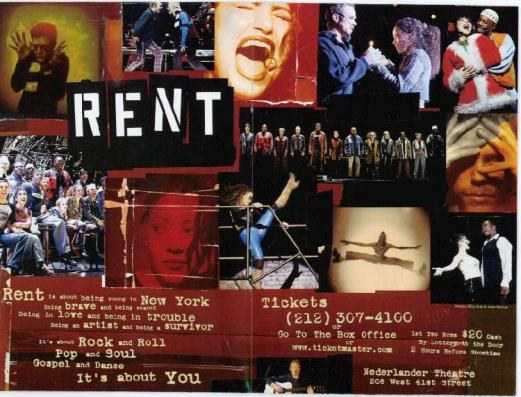 Act up, fite aids RENT logo the set a RENT ad Broadway cast Changing faces RENT Playbill Christmas bells La Boheme dancing Take me or leave me Seasons of love