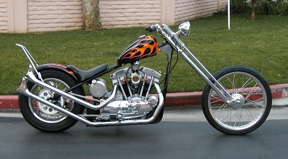 This here is the incarnation of my mental model of what choppers are all about. Back when I grew up, dude's didn't make choppers out of big twins. The whole point was light weight and fast, and that pretty much rules out big twins, now don't it? Choppers were built from either Brit iron like Triumphs and Nortons, or they were Sportsters.
