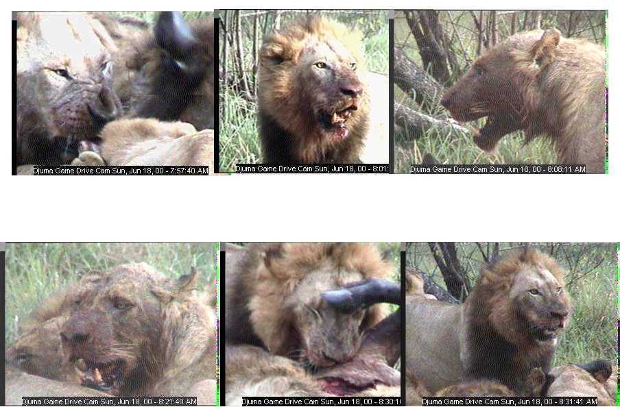 It was my last drive before leaving for home, of course I had hoped for something special. My guide had said we would look for 6 rhino that had passed into Djuma the day before. Great I thought. Then not far from camp, we found lion tracks. Not lion again I thought!? We had seen them 4 of the last 5 days! So the tracker and driver stop,get out and leave us alone in the landi to see where the lion tracks lead. This causes some guests concern as we are left alone..."What if the lions come back and they arent here?" Abel and Piet return shortly and we carry on down the road for sometime. We hear some buffalo sounds, and stop to listen to where they are coming from. We have no doubts! We can hear them stampeding through the bush and right towards us!! They appear a herd of about 40-50 cape buffalo, heading straight at us. They stop about 10ft short of our vehicle, look all around and take off again. That alone would have been thrilling enough! We figure the lions were the cause but dont see any...yet. We carry on a little and see a fallen buffalo near a drainage ditch, Piet thinks maybe it fell and was trampled by the herd alittle. It gets up and runs away dazed but seemingly ok. Just then a lioness darts by, followed closely by a young male. We turn and see the female has the 5 month old buffalo by the mouth and nose(we are told so it doesnt make noise and cant breath) and the male has it by the throat. They twist some and take the young buffalo to the ground. It puts up a struggle, such that I can only imagine how a fully grown adult would fite. One lady in our jeep is in tears and cant watch nor listen...her husband (at time of typing LOL) says "close your eyes,cover your ears and give me the damned camera!"(for which I am sure he paid dearly for back at camp LOL). A young 13 year old girl turns a curious shade of green. Soon 5 more male lions arrive, its the remainder of the Manuletti Pride. They begin to feast b4 the buffalos last breath is taken. The feast ensued. Lions which arrived a golden yellow, were soon dripping blood from their chins as they gorged themselves(lions can eat around 50kg or 100lbs in a sitting and dont chew just swallow). We could see their bellies grow. Occasionally they would take a breather from inhaling meat, looking around at the gathering of onlookers. In notime there is only skin and ribs left. The lions, buddies any other time growl and snarl visciously at each other vying for the best parts. I know this is not everyones thing but to see the whole scenario unfold like from a National Geographic movie was awesome. We were very lucky, even Link our intrepid vgd camera operator has never seen a kill from start to finish like that! Thanks to Piet and Abel for forgetting about the rhinos and giving me another memory I will forever carry with me. More Adventures
