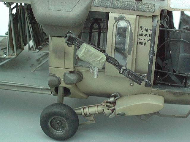 overall helicopter drab, then shaded with black over heavy panel lines and dark spots on the real thing. I mixed up Marine Corps Gulf Sand, Sand, Armor Sand and a touch of light grey for the final overal color,knowing I needed to apply it thin in spots and not at all on uppermost and lower surfaces. the mounting point covers for the external wings, rotor hubs, wheels and ALQ 144 are green and did not recieve sand paint.