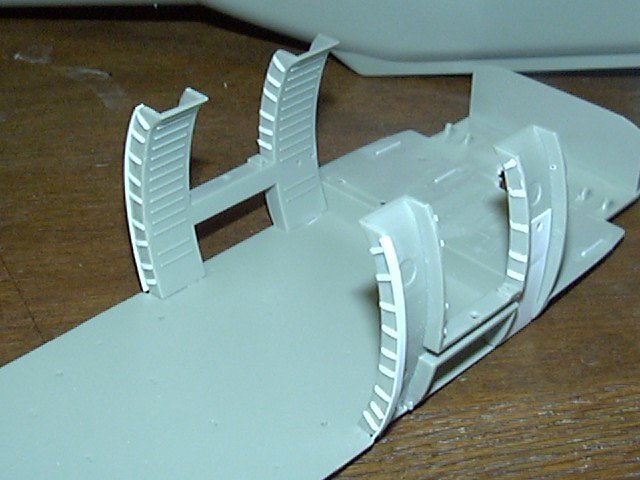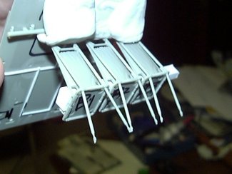 poster putty to get them just right. When its all adjusted, go ahead and put a drop of cement on the part of the leg that will attach to the seatbottom, after it sets for a minute, pull the roof off the broomclosets and add the legs. Let the glue set up a bit, and allow the legs to hang as they will. the idea here is that when the seats/roof are reinstalled, the legs will be compresed to the proper shape. Dont forget that the seat legs dont just hang down, they point aft to a central point between each seatback, except for the outermost leg, which hangs straight back. All legs point aft in all cases. Study the pics here and you will get a better idea of how to do this. In fact, this process will take three nights, and you will find it much much easier than going at it one seat at a time. When your all done with a row, pull that set out and set them in a