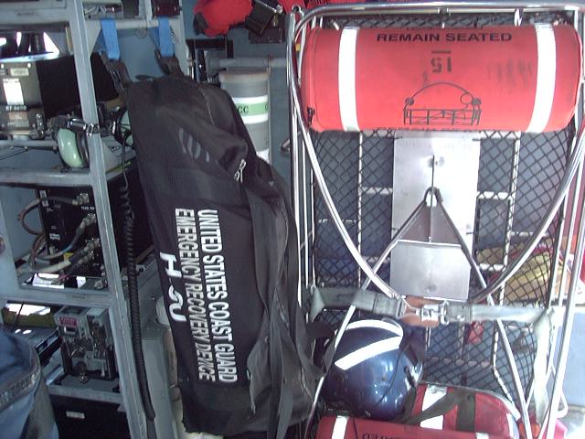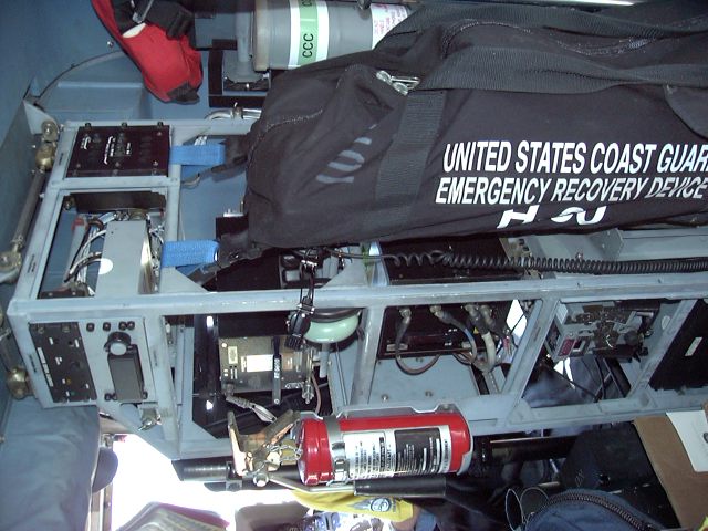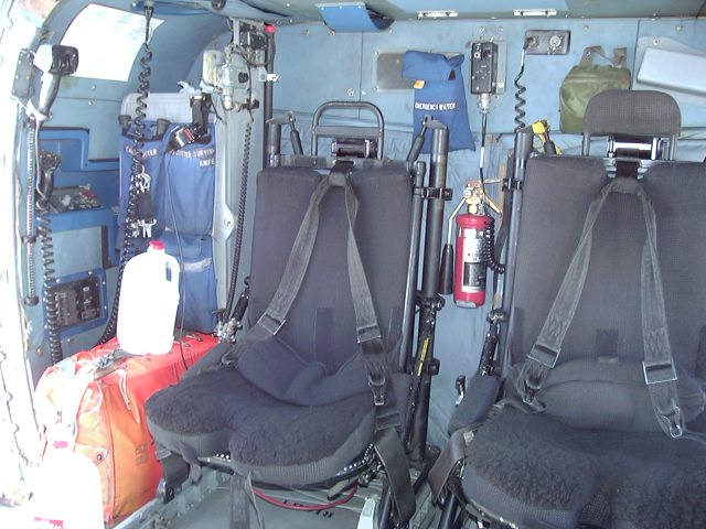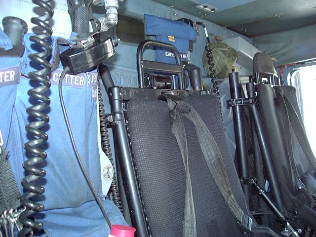 aft cabin. Radio rack is behind pilots seat, emergency gear behind that along wall, and rescue basket