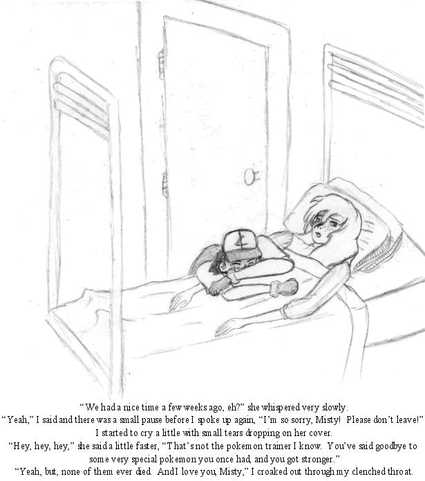 The complete opposite of what happened in the happy ending. Misty is about to die and Ash can't stop crying about it. Again, the dialog is at the bottom. Just to let you know, by seeing these pics, you'll get a better idea of what they looked like in my dream (not to mention a glimpse of what my house and bedroom looks like)!
