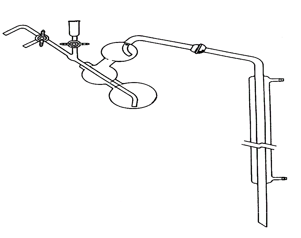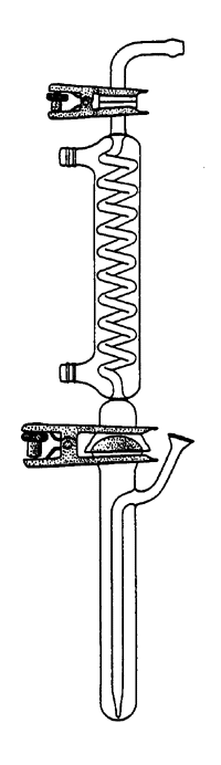 This apparatus is used for the analysis and determination of cyanides and ferrocyanides in wines, according to the method outlined in Methods for Analysis of Musts and Wines by M. A. Amerine and C.S. Ough(John Wiley and Sons, 1980). In this modified form, the apparatus is now the standard test equipment in the wine industry. It consists of an aeration tube, a spiral condenser, glass flanges and the necessary clamps. Connections are air-tight to assure accruacy. |