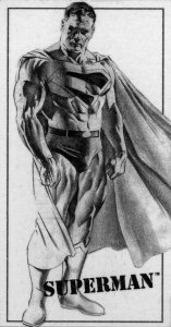 - Here is another picture of Superman drawn by Alex ross. His ensignia is a bit different and you'll also notice he looks older as this comes from a storyline set in the future called Kingdom Come. If you want details, read the comic books as I'm at a loss to explain. I haven't read them yet either.