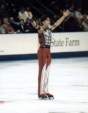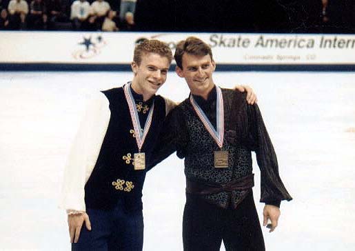 Emanuel Sandhu - wearing half blue/half black top with black pants and skated to techno music. Fell on quad attempt, fell on triple axel, triple flip okay, popped axel, triple sal okay. Nice spread eagle, crossfoot spin nice - really nice presentation despite the jump problems - crowd loves his dancey footwork and so do I. Triple loop/triple toe, triple lutz, stepped out of last jump and slipped on his spin combo. Technical:Alexei Yagudin - wearing his latest "Gladiator" costume and skating to "Gladiator," of course. We were really anxious to see this as he had never run through the program completely in practice and we've only seen the exhibition and pro/am versions before. He opened with a quad attempt in our corner, doubled it, and then went to the other corner to try again and also doubled it. The audience seemed shocked at this point, and when he followed that with a hand down on his triple axel, the place seemed very quiet. But he rallied with a nice triple flip/triple toe (this had been a triple flip/triple loop in practice), another triple axel that looked like he might have a hand down but I think he saved it, did a spin combo here, spread eagle into Besti squat, followed by a good triple loop and another good triple (sal?) and then doubled his lutz, then his final spin combo which included a Mazurka and martini glass spin. Presentation was quite good, actually, despite the technical problems in the program. I think he knew he was in trouble after the two popped quad attempts and decided to save the program on presentation, which I think he did. He looked very tired at the end, and extremely dejected in the Kiss and Cry. He left when he saw the presentation marks up, but before they were announced. Technical:Well, it wasn't the men's finals we wanted to see, of course. We were all thinking that Alexei simply *must* spend at least three or six months training at a high altitude location prior to Salt Lake City. But the exhibition programs from the medalists were held right after the men's finals, and he rallied so fantastically in his exhibition program to "Gladiator" (and, no, he didn't change to the "thights" version - darn! LOL, another "inside-board" joke...), when he should have been at death's door, that we're wondering if maybe he's psyched himself out into thinking he has a bigger problem with altitude than he does. I mean, he definitely has a problem with altitude, but we were just amazed at the vitality and energy he came up with for the exhibition. Of course, Alexei is usually able to gut his way through something we think might be impossible for anyone else, so maybe that's how he got through his exhibition program. But, really, if you had seen it (they never show SA exhibitions on TV, so you won't get to see it - too bad, because he was *so* good!), you would never have known this same guy strugged through his long program just a little while earlier. Some of us saw him later at the hotel. He seemed quiet and sad. And we still think Alexei should move his training location to a high altitude place for at least three to six months before the Salt Lake City Olympics take place. If for no other reason than confidence building. Laurie ![]() Tim and Todd during the photo op after the medal ceremonies. Alexei didn't stay afterwards. |