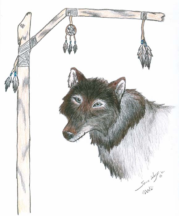 More new wolf art. I really like the way this one turned out. The dreamcatcher is suppose to represent the Moon :)