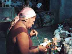 Sentada en el piso de tierra en el interior de su pequeña casa de madera, la mujer de pies descalzos, callada y concentrada en su labor, pintaba con óleo de colores algunas piezas todavía negras por el tono del barro con que son elaboradas.