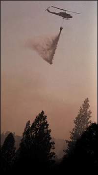 A helicopter from the Big Hill Helitack Base in Eldorado National Forest drops water on a wildfire on Cedar Song Road Friday evening. (Photo by John Hart)