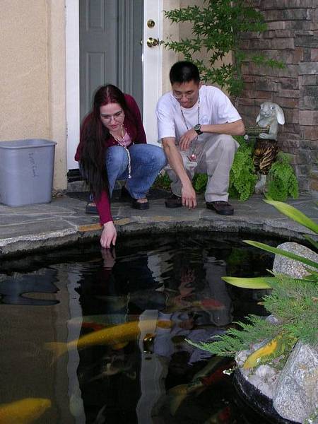 There we are by Jon's pond: his mother really did a beautiful job on the landscaping. Jon said you could actually pet the koi fish, so that's what I was trying to do.