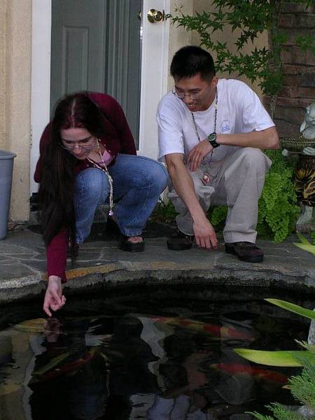 Lisa and Jon are trying to pet the koi but the fish continually tease by turning away at the last moment. They were no fools; they weren't going to allow themselves to be touched without any food being fed to them.